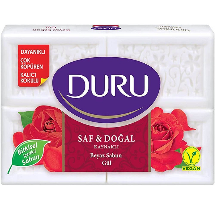 صابون دورو با رایحه گل رز Duru با بسته 4 عددی دارای محتوای 100% گیاهی هستند و با فرمول قوی خود ، هم پوست شما را از آلودگی پاک می کند و هم با گلیسیرین دوستدار پوست از آن محافظت می کند . این صابون با سابقه 90 ساله خود ، یکی از محبوب ترین برندهای صابون در ترکیه و جهان است و با مواد طبیعی خود از پوست شما مراقبت می کند .