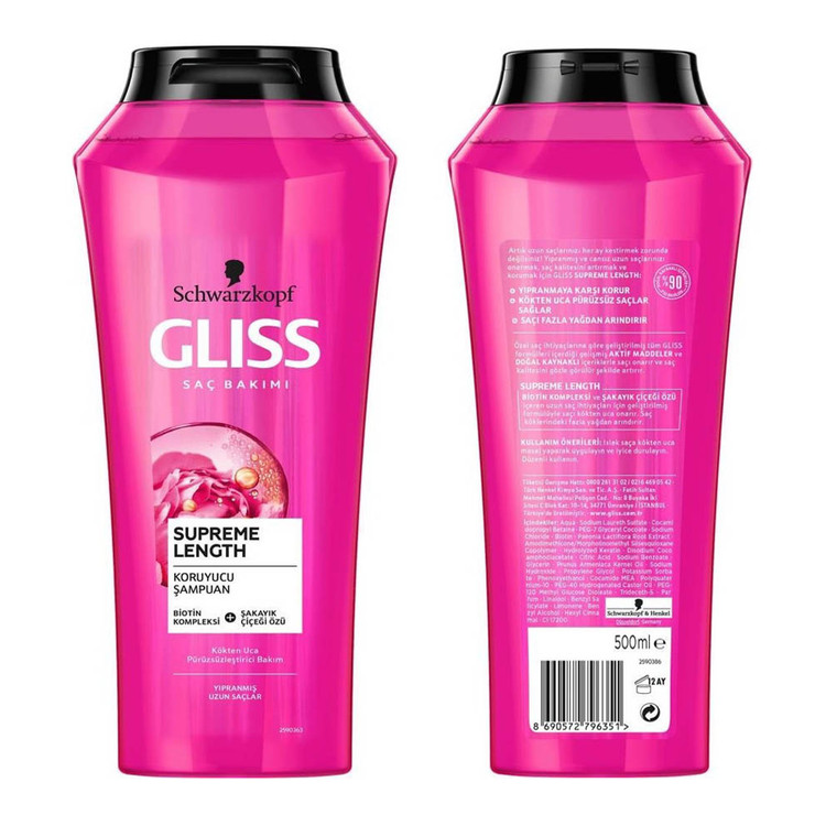 شامپو گلیس درخشان کننده رنگ صورتی مدل GLISS SUPREME LENGTH بسیار با کیفیت تر از نمونه شرکتی آن است که در داروخانه ها به فروش میرسد. این محصول کاملا اصل و ساخت کشور ترکیه و تحت لیسانس آلمان میباشد. همچنین حجم این شامپو 500 میل است و با قیمت مناسبی که دارد بسیار به صرفه تر از نمونه های شرکتی بازار است.