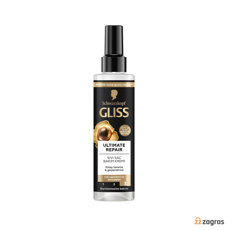 فرمولاسیون ویژه و ابداعی موجود در اسپری دو فاز گلیس مشکی مدل Ultimate Repair برای موهای خیلی آسیب دیده 200 میل علاوه بر تأمین مواد مورد نیاز مغذی و ترمیم کننده ساختار مو، حاوی ۳ برابر کراتین مایع بیشتر می باشد. مواد مؤثره موجود در این محصول علاوه بر ترمیم کامل قسمت های آسیب دیده ساختار مو موجب احیاء و بازسازی کوتیکول مو نیز می گردد و در نتیجه خشکی و شکنندگی مو برطرف گردیده و گیسوان نرم، لطیف و براق می گردد.
