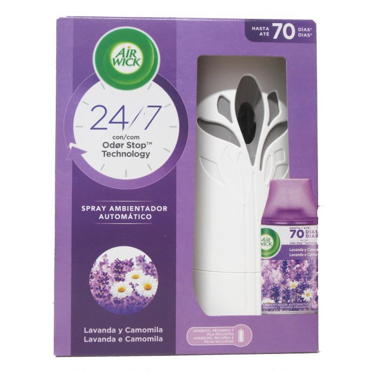 دستگاه اتوماتیک اسپری Air Wick به همراه یک عدد اسپری خوشبو کننده هوا با رایحه اسطوخدوس و بابونه - حجم 250 میلی لیتر - دارای قابلیت تنظیم زمان اسپری کردن